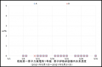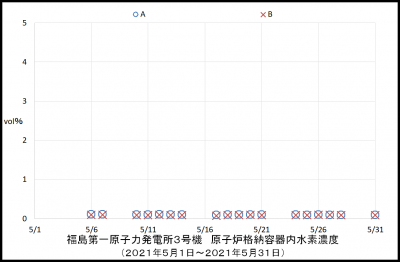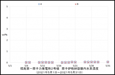 燃料デブリ等の強い放射線により冷却水の一部が分解されて水素が発生します。水素爆発の発生を防止するため、原子炉格納容器内に窒素を注入するとともに、水素濃度の監視も行っています。実施計画では格納容器内水素濃度が2.5vol%以下になるように求められています。