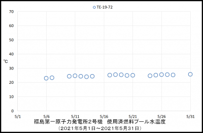原子炉建屋最上階に位置する使用済燃料プール水温を示しています。1号機には292体、2号機には587体の使用済燃料が保管されています。なお、3号機については令和3年2月に使用済燃料プールからの燃料搬出が完了しています。
