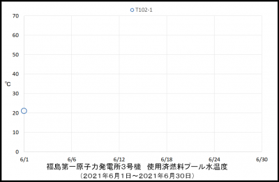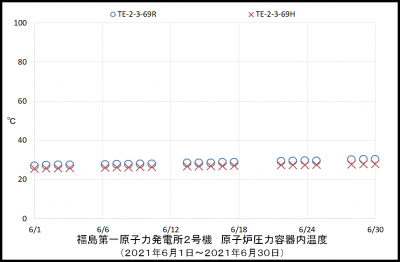 原子炉建屋最上階に位置する使用済燃料プール水温を示しています。1号機には292体、2号機には587体の使用済燃料が保管されています。なお、3号機については令和3年2月に使用済燃料プールからの燃料搬出が完了しています。