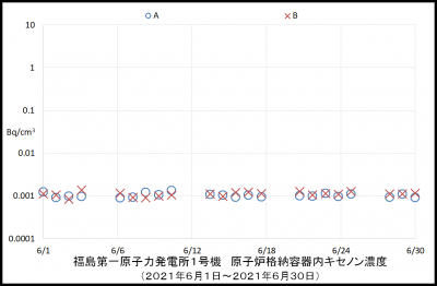 核燃料であるウランが核分裂する際にキセノンが発生することから、定常的に核分裂が発生していないことを確認する指標として原子炉格納容器内のキセノン濃度を監視しています。実施計画では1ベクレル/立方センチメートル以下であることが求められています。
