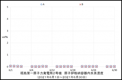燃料デブリ等の強い放射線により冷却水の一部が分解されて水素が発生します。水素爆発の発生を防止するため、原子炉格納容器内に窒素を注入するとともに、水素濃度の監視も行っています。実施計画では格納容器内水素濃度が2.5vol%以下になるように求められています。