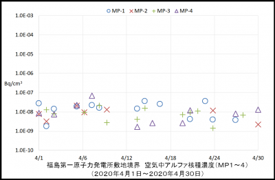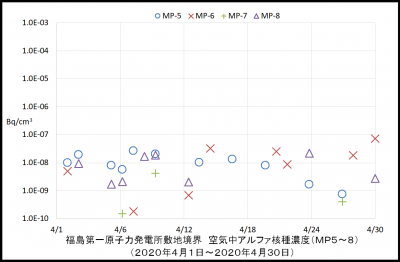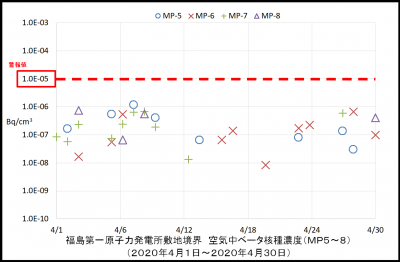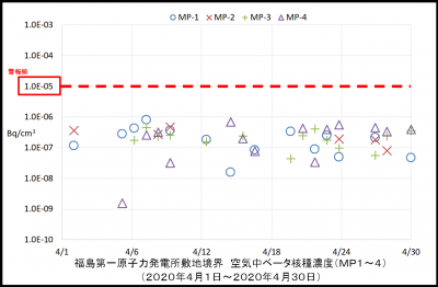 東京電力ホールディングス株式会社が福島第一原子力発電所の敷地境界にあるモニタリングポスト(MP-1~MP-8)近傍に設置されているダストモニタを用いて空気中の放射性物質濃度を24時間連続で測定しています。