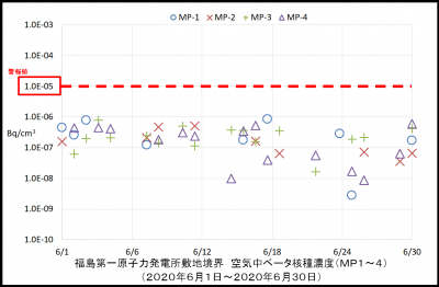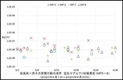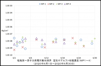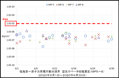 東京電力ホールディングス株式会社が福島第一原子力発電所の敷地境界にあるモニタリングポスト(MP-1~MP-8)近傍に設置されているダストモニタを用いて空気中の放射性物質濃度を24時間連続で測定しています。