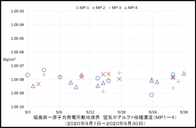 現地駐在では、敷地境界付近での空気中アルファ核種濃度に日々大きな変動がないことを確認しています。
