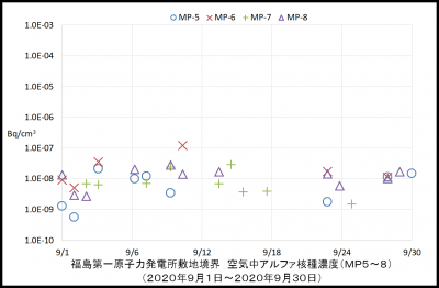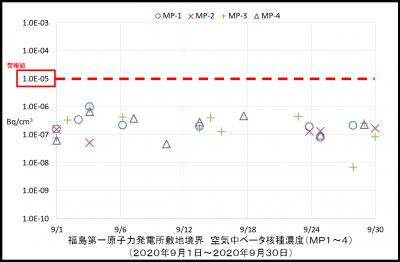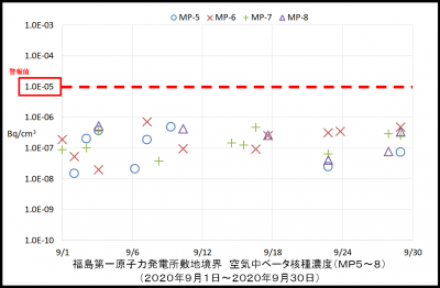 東京電力ホールディングス株式会社が福島第一原子力発電所の敷地境界にあるモニタリングポスト(MP-1~MP-8)近傍に設置されているダストモニタを用いて空気中の放射性物質濃度を24時間連続で測定しています。