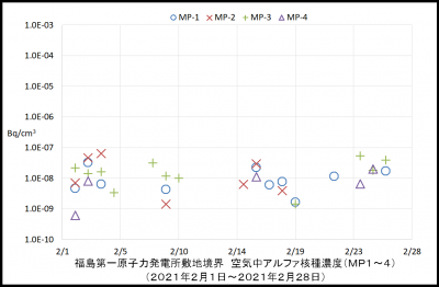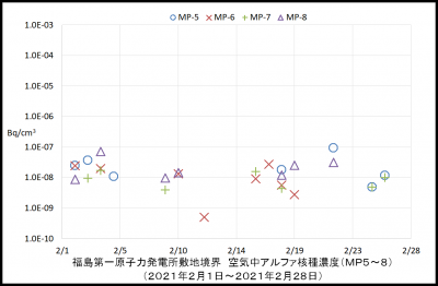 東京電力ホールディングス株式会社が福島第一原子力発電所の敷地境界にあるモニタリングポスト(MP-1~MP-8)近傍に設置されているダストモニタを用いて空気中の放射性物質濃度を24時間連続で測定しています。