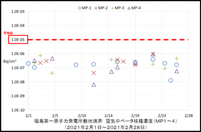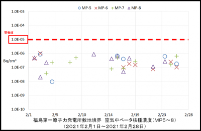 なお、東京電力ホールディングス株式会社福島第一原子力発電所では警報値を0.00001ベクレル/立方センチメートルとして監視しています(警報値の根拠:周辺監視区域外の告示濃度(3ヶ月間平均濃度(セシウム134代表))の2分の1の値)。