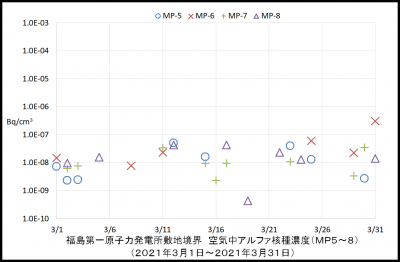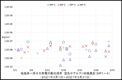 東京電力ホールディングス株式会社が福島第一原子力発電所の敷地境界にあるモニタリングポスト(MP-1~MP-8)近傍に設置されているダストモニタを用いて空気中の放射性物質濃度を24時間連続で測定しています。