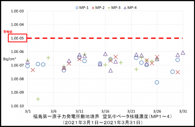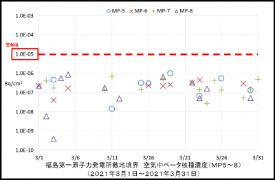 なお、東京電力ホールディングス株式会社福島第一原子力発電所では警報値を0.00001ベクレル/立方センチメートルとして監視しています(警報値の根拠:周辺監視区域外の告示濃度(3ヶ月間平均濃度(セシウム134代表))の2分の1の値)。
