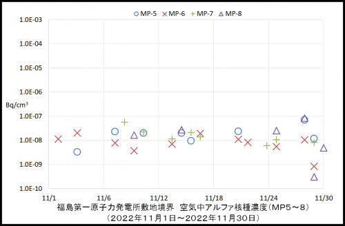 東京電力ホールディングス株式会社が福島第一原子力発電所の敷地境界にあるモニタリングポスト(MP-1~MP-8)近傍に設置されているダストモニタを用いて空気中の放射性物質濃度を24時間連続で測定しています。