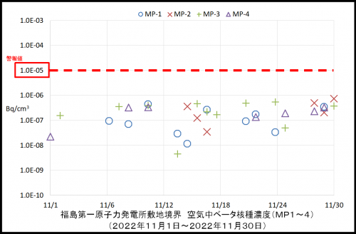 なお、東京電力ホールディングス株式会社福島第一原子力発電所では警報値を0.00001ベクレル/立方センチメートルとして監視しています(警報値の根拠:周辺監視区域外の告示濃度(3ヶ月間平均濃度(セシウム134代表))の2分の1の値)。