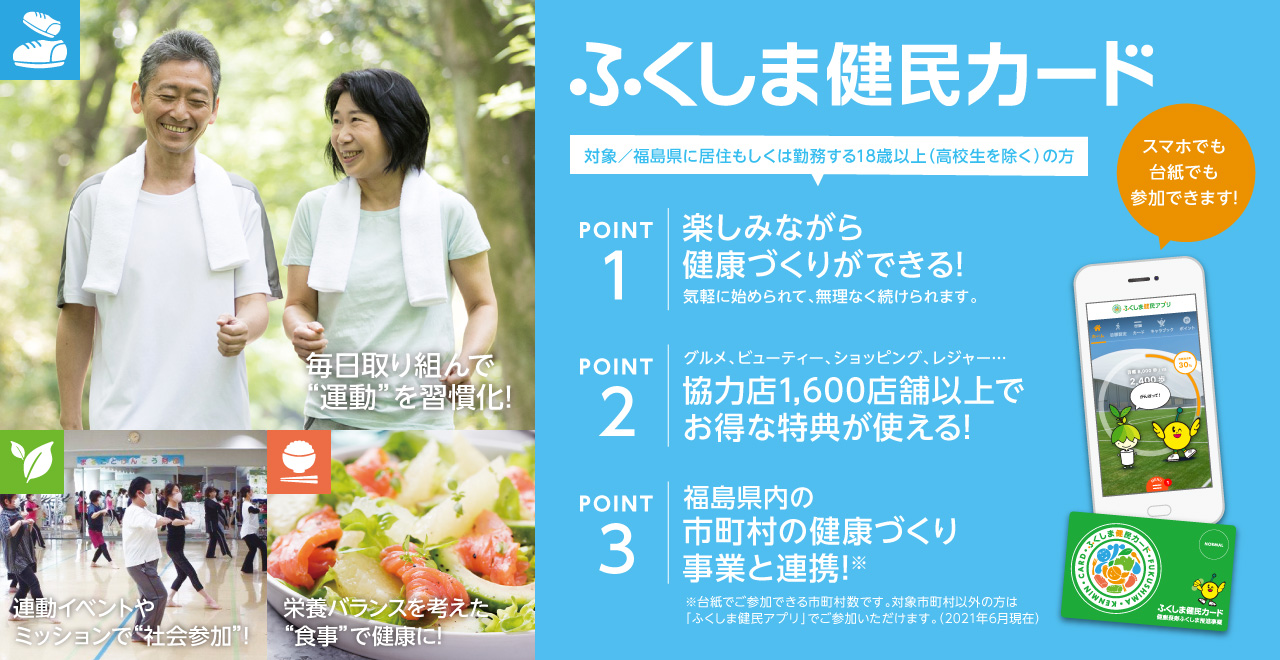 健康ふくしまポータルサイトは、健康づくりに役立つ情報や取り組みなどをまとめた福島県の公式サイトです。県民1人ひとりが自分のからだと、食や運動、社会参加などの課題や効果などについて知り、楽しく健康づくりを実践するきっかけをつくっていきます。