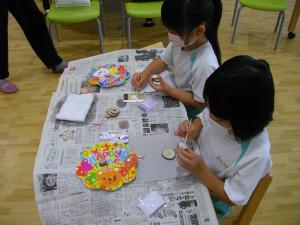 次の20園には、森林の役割や大切さを伝えるボランティアである「もりの案内人」を派遣し、もりの案内人と一緒に、間伐材や木の実などを使った工作を行いました。