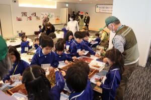 次の20園には、森林の役割や大切さを伝えるボランティアである「もりの案内人」を派遣し、もりの案内人と一緒に、間伐材や木の実などを使った工作を行いました。