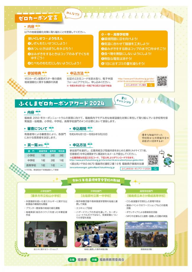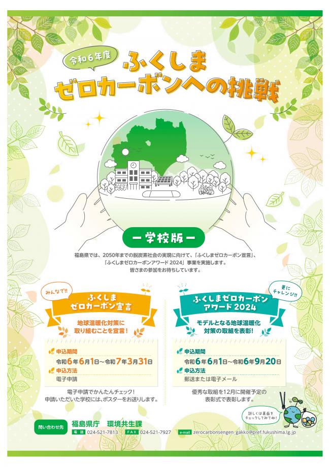 「ふくしまゼロカーボン宣言事業(学校版)」は、2050年カーボンニュートラルの実現に向けて、県内の保育施設、幼稚園、小・中・高等学校等(小学校、中学校、義務教育学校、高等学校、中等教育学校、特別支援学校、高等専門学校)が取り組むべき内容を「見える化」することで、園児・児童・生徒等と教職員が一体となった地球温暖化対策を推進し、環境配慮意識の醸成を図る事業です。