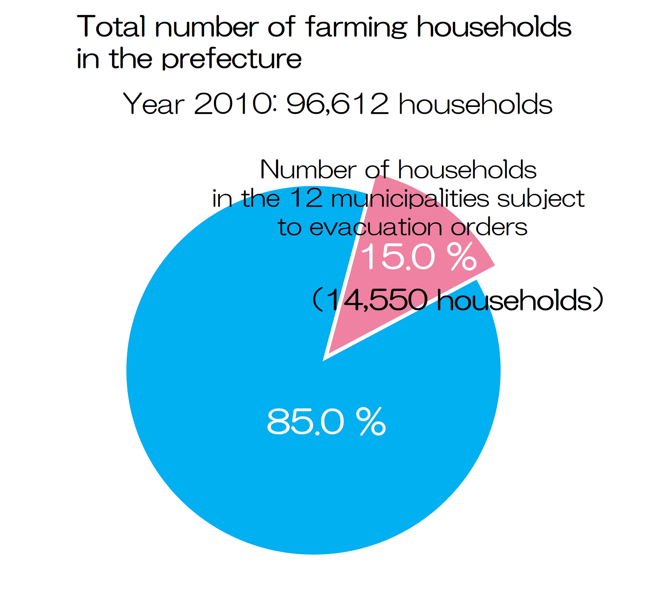 - For instance, the total number of farming households was approximately 14,600 in the 12 municipalities*1 where evacuation orders were issued as a result of the nuclear accident. This represents approximately 15.0% (*2) of the pre-disaster total of 96,600 farming households in the prefecture.