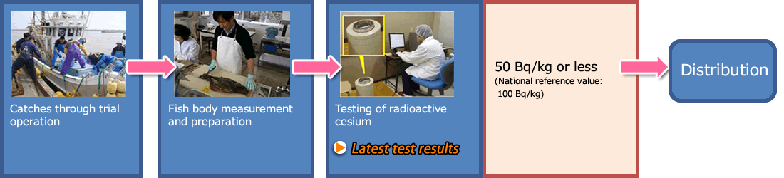 The Fishery Cooperative Association set voluntary standards [50Bq/kg], stricter than that of the national government for the national standard of “General foods [100Bq/kg] ” for catches to be sold through trial fishing, and conduct screening for radioactive substances