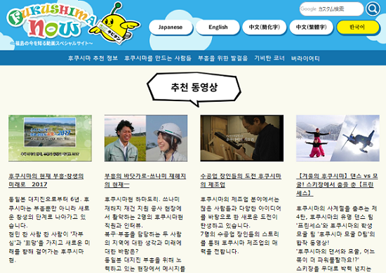 동일본 대지진에 의해 지진, 쓰나미, 원자력 발전소 사고라는 미증유의 복합 재해 피해를 입은 후쿠시마현의 부흥은 착실하게 진행되고 있습니다. 한편 폐로나 잘못된 소문과 풍화 문제 등, 후쿠시마현 특유의 과제도 산적해 있습니다. 본 사이트는 ‘후쿠시마 부흥의 현황’을 알리는 후쿠시마현 공식 포털 사이트입니다. ‘동일본 대지진으로부터의 복구 및 부흥’ 등 5가지 카테고리로 분류해 정리되어 있으므로, 본 사이트를 통해 많은 분들이 후쿠시마현의 현황을 알아주시면 감사하겠습니다. 앞으로도 전례 없는 복합 재해로부터의 부흥을 목표로 ‘하나씩 실현하는 후쿠시마’라는 슬로건 아래, 후쿠시마의 밝은 미래를 향한 도전을 계속해 나가겠습니다.