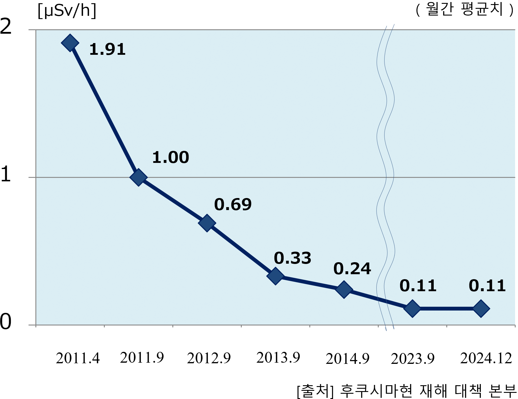 - 아래의 그래프는 후쿠시마시에서의 공간선량률 추이를 나타낸 것입니다. 지진 재해 직후는 1.91μ㏜/h였지만 자연 감쇠와 제염 등에 의해 해를 거듭할수록 공간선량률은 감소해 2025년도에는 0.11μ㏜/h가 되었습니다. (지진 직후의 약 17분의 1)
