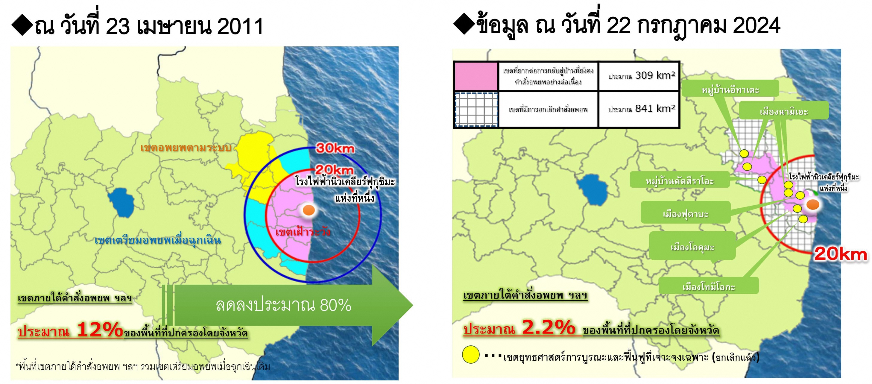 ตั้งแต่เดือนมิถุนายน ปีเรวะที่ 4 (ค.ศ. 2022) จนถึงเดือนพฤศจิกายน ปีเรวะที่ 5 (ค.ศ. 2023) มีการยกเลิกคำสั่งอพยพทั้งหมดของเมืองและหมู่บ้าน 6 แห่ง (เมืองโทมิโอกะ เมืองโอคุมะ เมืองฟุตาบะ เมืองนามิเอะ หมู่บ้านคัตสึราโอะ หมู่บ้านอีทาเตะ) ที่ถูกกำหนดให้เป็นเขตยุทธศาสตร์การบูรณะและฟื้นฟูที่เจาะจงเฉพาะ