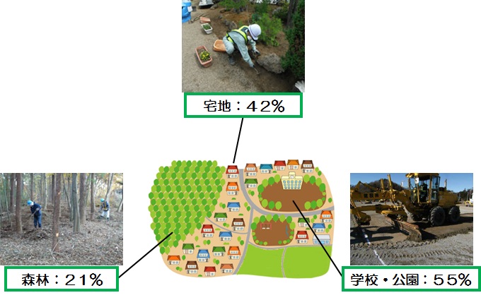 市町村除染地域における除染作業前後の空間線量率を集計したところ、面的除染によって宅地では42%、学校・公園では55%、森林では21%の線量低減効果が確認されています。