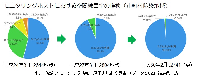 モニタリングポストにおける空間線量率は、除染に加え、時間の経過や風雨による自然減衰等によって、おおむね毎時0.23マイクロシーベルト未満となっています。