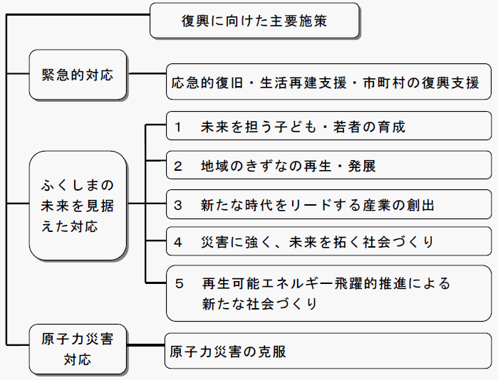本県は、地震、津波による被害のほか、収束の見えない原子力災害、これに伴う風評被害に苦しんでいますが、県民の皆様に対して復興に向けた希望の旗を立て、すべての県民が思いを共有しながら一丸となって復興を進めるため、復興に向けての基本理念と主要施策をまとめた「福島県復興ビジョン」を策定しました。