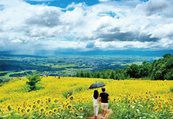 A flower field using the slopes of Sannokura Ski Resort, which overlooks the Aizu Basin. Rape blossoms bloom in spring, and about 2 million sunflowers bloom from summer to autumn.