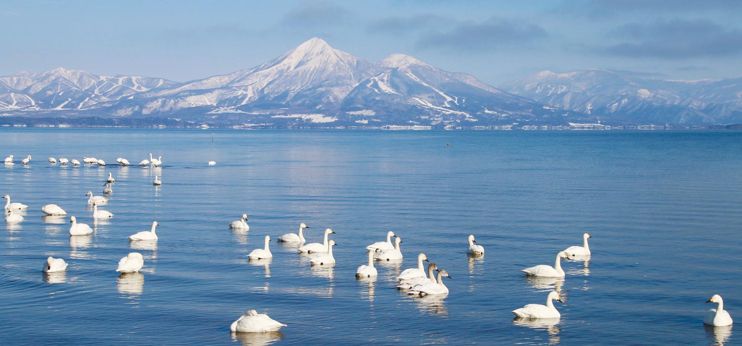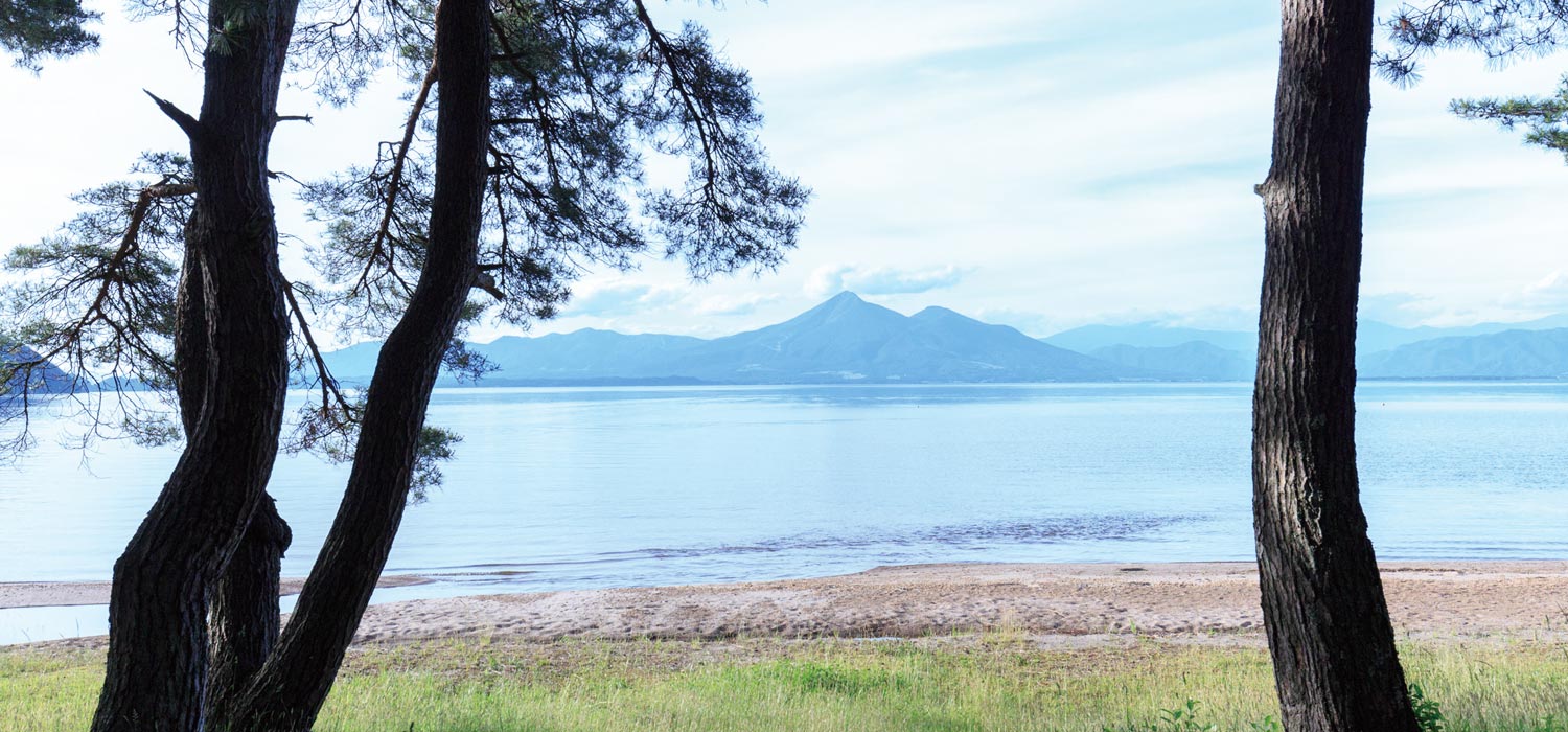 樹齢100年を越す青々とした松林と白く続く砂浜が日本らしい湖岸風景を見せる青松浜は、有栖川宮威仁親王の元保養地で、大正天皇によって命名されたといわれています。遠浅で波の穏やかな湖岸の向こうに雄大な磐梯山を望みます。冬は白い磐梯山を背景に、越冬のために飛来した白鳥が静かな猪苗代湖に浮かぶ雪景色が見られます。
