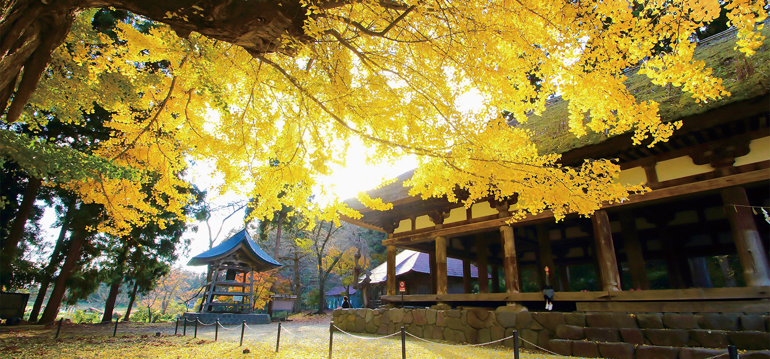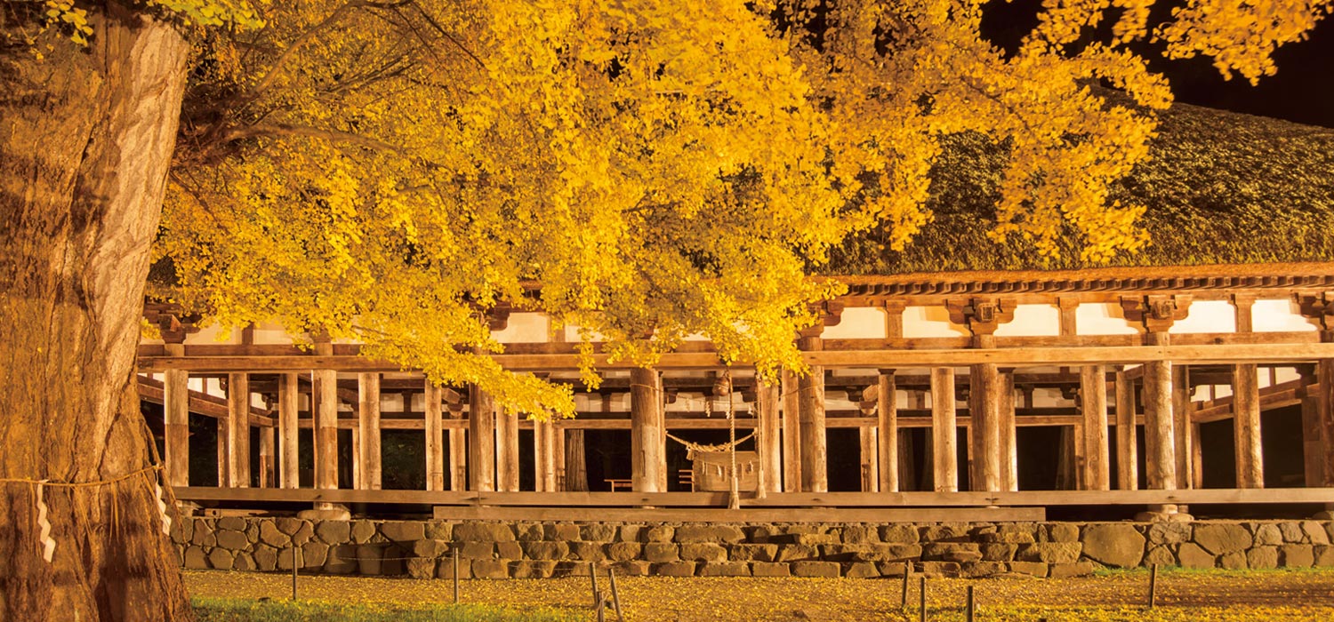 源頼義の勧請とされる新宮熊野神社。拝殿の「長床」は、国指定重要文化財に選定されており、44本の太い柱に芧葺寄棟造りの荘厳な建物です。境内には樹齢800年以上といわれる御神木の大イチョウがあり、紅葉の見頃にはライトアップも実施され、落葉した黄色い絨毯と、長床の美しい光景を見ることができます。