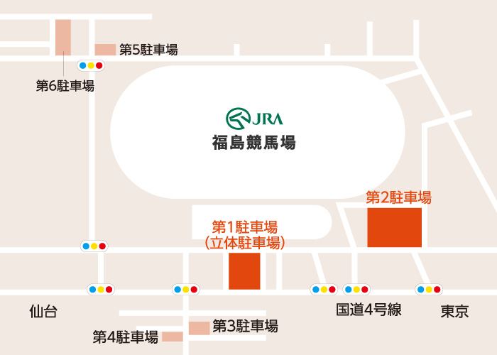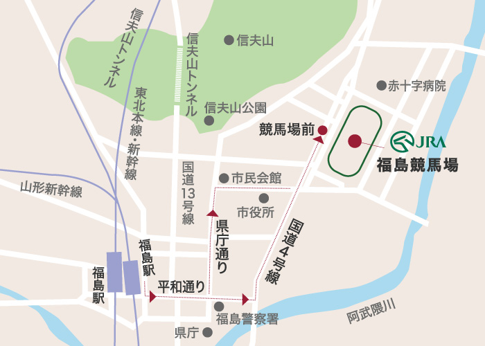 - JR福島駅(東口)バスターミナル2番のりば・3番のりばからバスで約15分、「競馬場前」下車。料金230円。