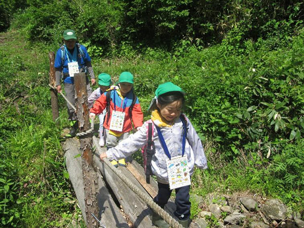 ⚪︎保育所周辺でも昆虫探し等をする子どもたちですが、森で巨大な樹木や藤のつるで枯れてしまった木などを見て、森林でおきている力強い自然の営みに新鮮な驚きを感じていました。また、不安定なはしごや変なブランコ、水の出ない手押しポンプなど、普段は触れることのないものにも挑戦していました。