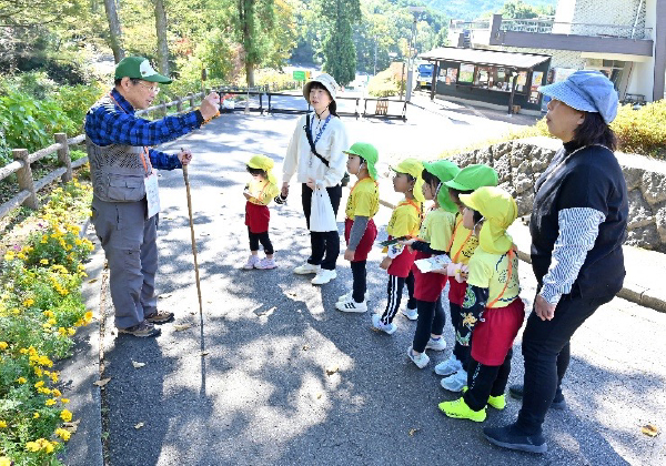 当日は天候にも恵まれ、良い天気のなか探索に参加することができた。グループごとにビンゴカードをもとに探索をしたが、昨年よりも色々な種類の木の実や植物が多く、子どもたちは興味津々で、何かを見つける度にすぐに質問し、もりの案内人さんのお話を熱心に聞いている姿が見られた。秋の自然にふれ、楽しいひとときになったのでとてもよかった。