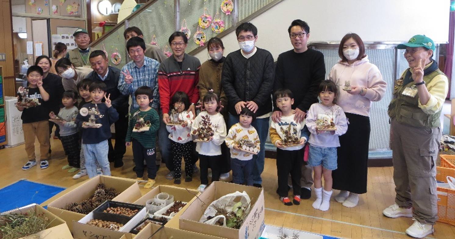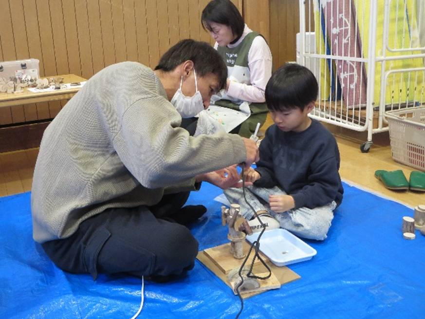 〇普段、森の中であそぶ経験も少ない子どもたちだけに、見たこともないたくさんの自然物に目を輝かせ、驚きを隠せない様子を見せていた。保護者も同様の様子だった。なかなか作りたいイメージがわかない子どもたちも、間近に自然物を見て触れることで、少しずつイメージが膨らんでいった。グルーガンでの制作は初めてだったが、保護者と一緒ということもあり、大きなけがもなく無理なく行うことが出来た。