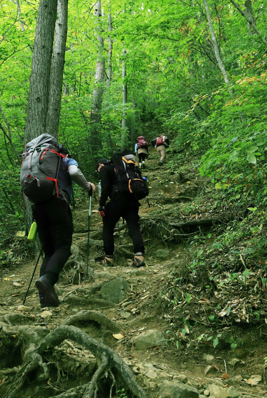 滝沢登山口から最初の30分は直登の急登です。ただし登山道は踏み固められているため歩きやすいので、休みながら自分のペースで登りましょう。頭上を見上げればブナやトチの落葉広葉樹が空を覆い、新緑や紅葉のシーズンなどは目を楽しませてくれます。