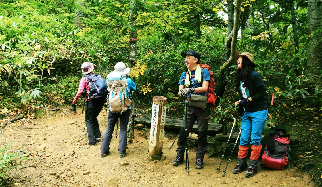 急登が落ち着いてから黙々と登っていくと、水場の札がある開けた休憩ポイントに到着します。そこから2分ほど下ったところが水場です。このあたりから登山道は針葉樹林帯に。木々の合間から空が見えはじめ、大戸沢岳の稜線が顔を出します。