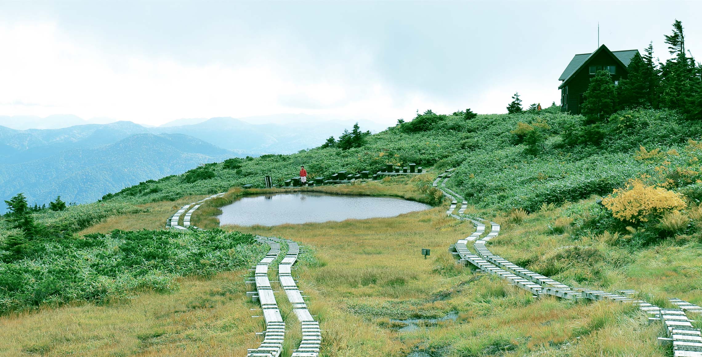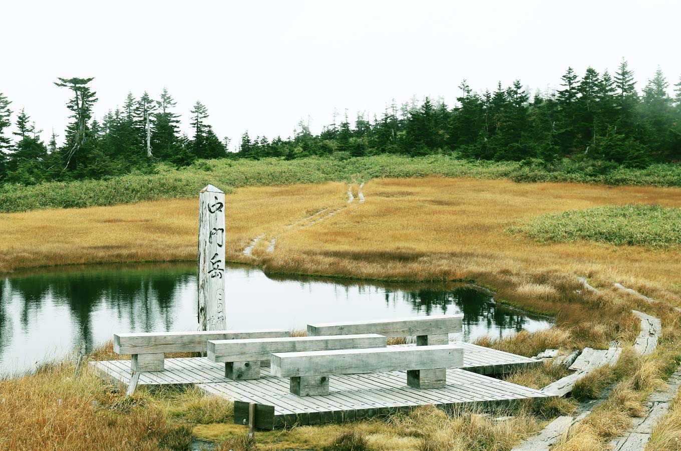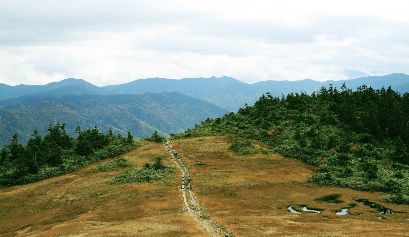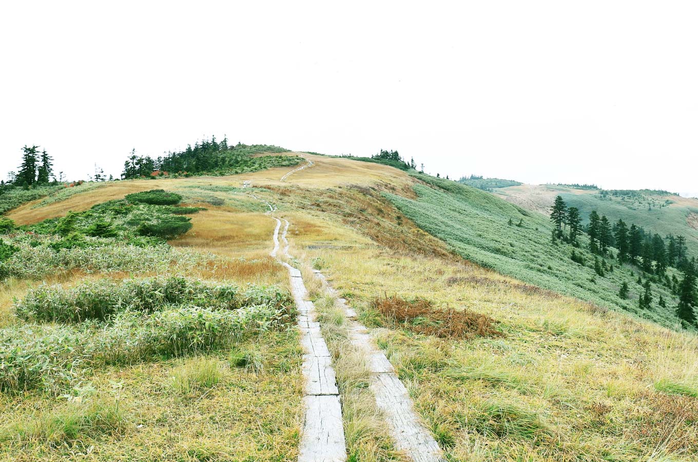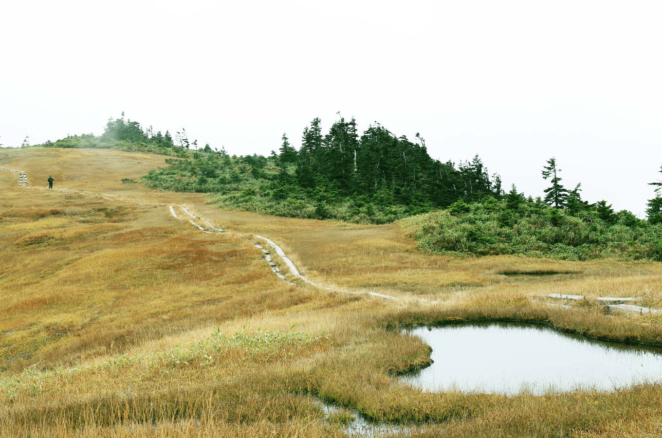 会津駒ヶ岳山頂から中門岳まで往復1時間30分~2時間の行程です。ゆるやかな起伏の道のりですが、壊れた木道箇所もあるので注意して歩きましょう。