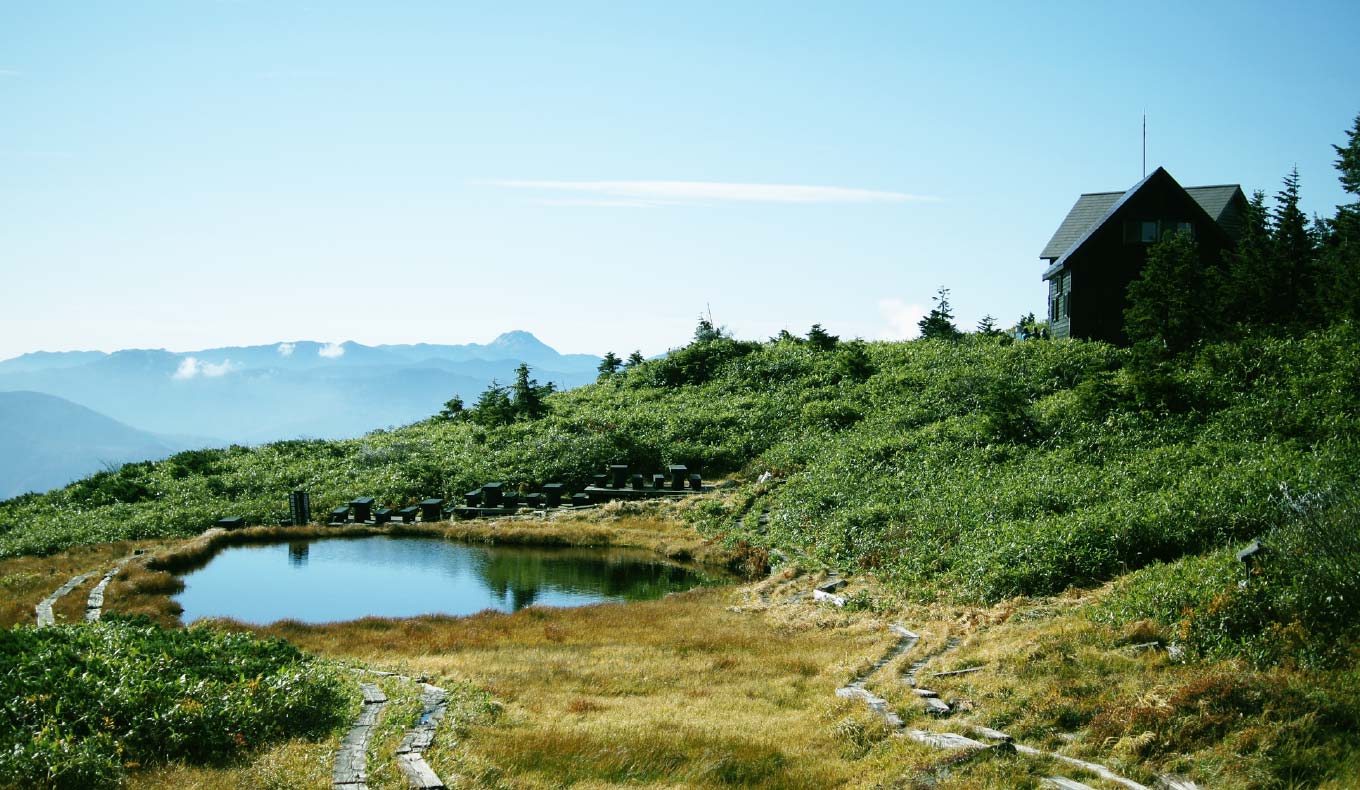 駒ケ岳登山口のバス停から約4時間かけて駒の小屋へ到着します。駒の小屋と駒ノ大池のある池ノ平は、本コースの象徴的なポイントの1つです。梅雨明け前後からハクサンコザクラが満開となります。また池のほとりに駒ケ岳大明神の祠があります。