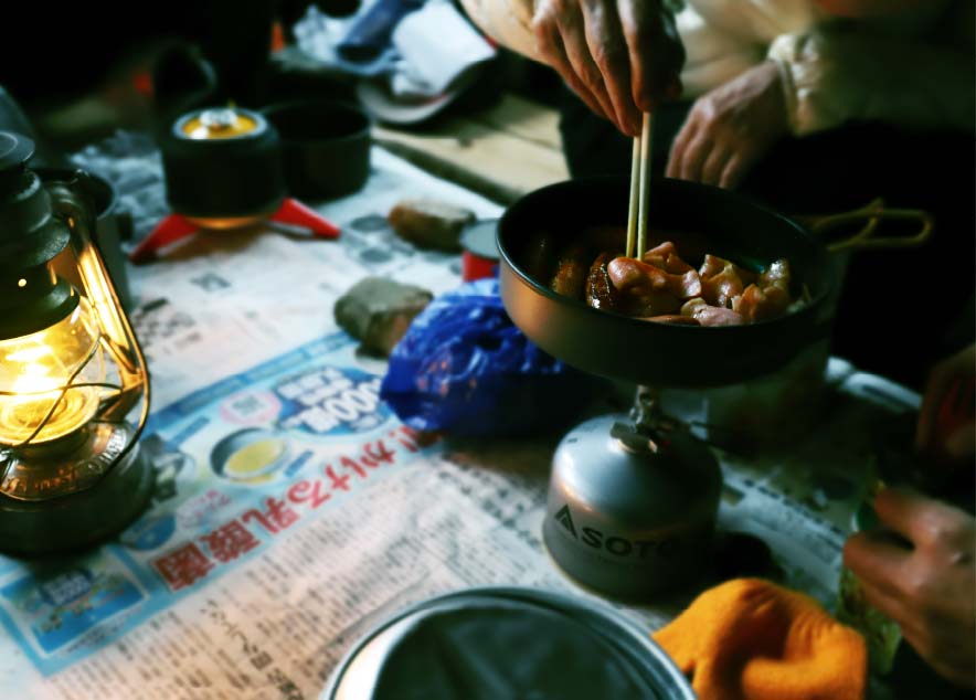 駒の小屋は設備的に食料提供が難しく自炊が基本です。しかしこの自炊が楽しみで、多くの方が食料や調理器具を背負って急登にめげず登山を楽しまれています。行動食やフリーズドライ食品で済ませる方がお手軽ですが、せっかくですから肉や野菜を持参し山上の調理にチャレンジしてみませんか。
