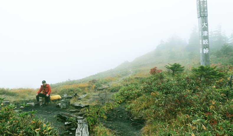 翌日は富士見林道で下山です。快晴ならば、その名の通り、燧ヶ岳の後ろに小さく富士山を眺められます。駒の小屋を出てすぐに痩せ尾根状の岩稜帯がある以外は注意箇所はありません。約1時間30分で大津岐峠(おおつまたとうげ)に到着します。