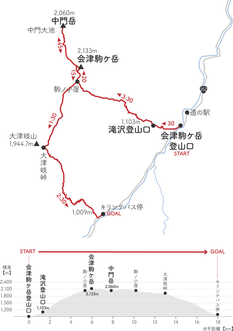 本コースは滝沢登山口から入山し、キリンテ登山口に下山する縦走ルートです。キリンテからはバスを利用することになるので、バスの時刻表を事前に調べておきましょう。登山仲間とクルマ2台で来た場合は、道路向かいの伊南川の川原沿いに1台停めておくと便利です。