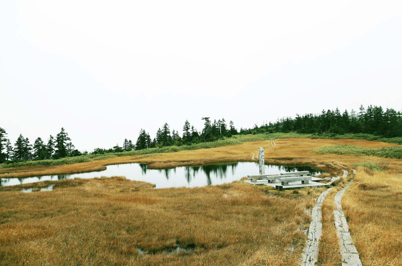 森林限界に到達すると会津駒ヶ岳の高層湿原が始まります。木道は右側通行。湿原へ足を踏み入れたり、ポールを突かないように注意しながら歩いてください。