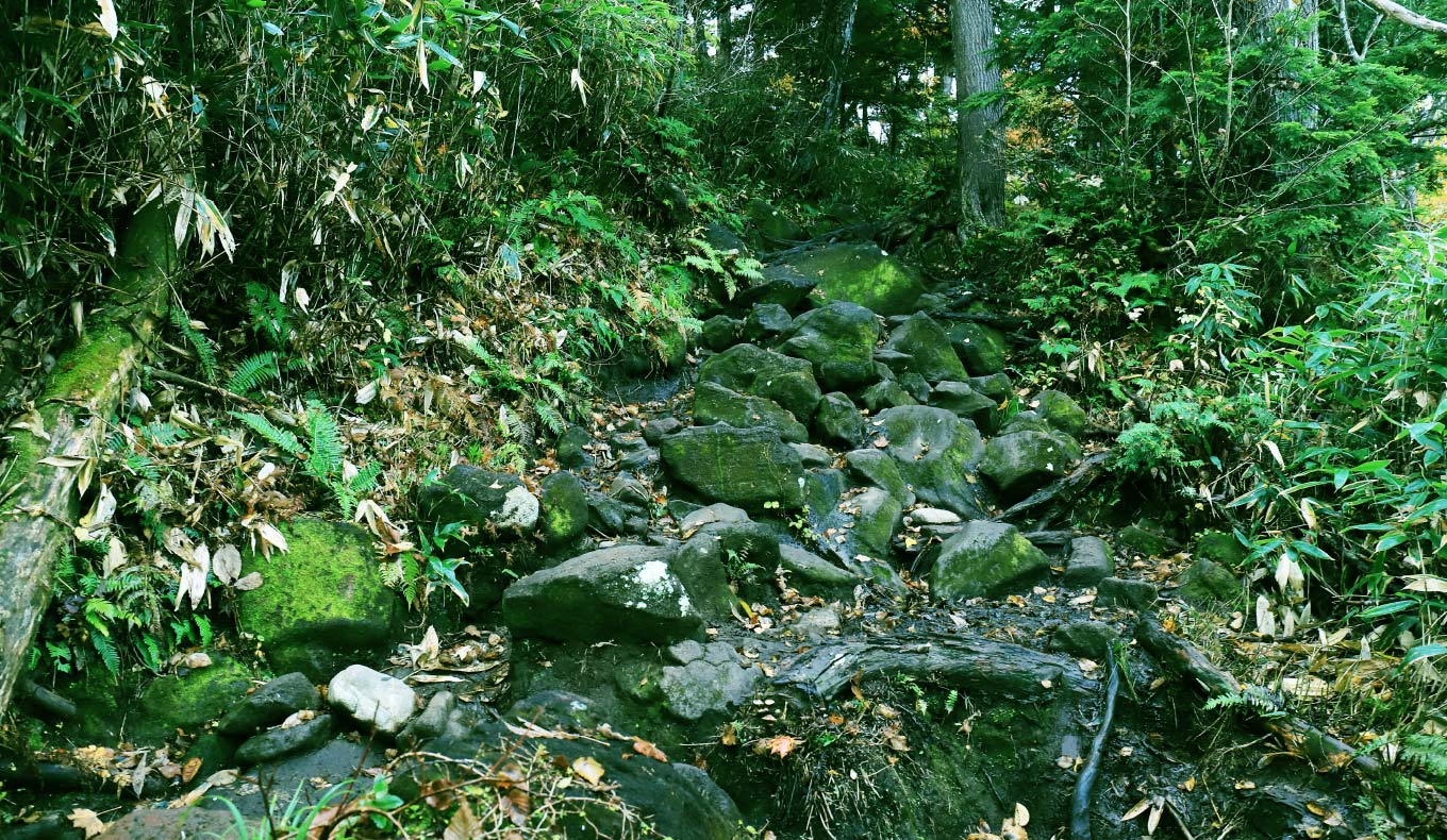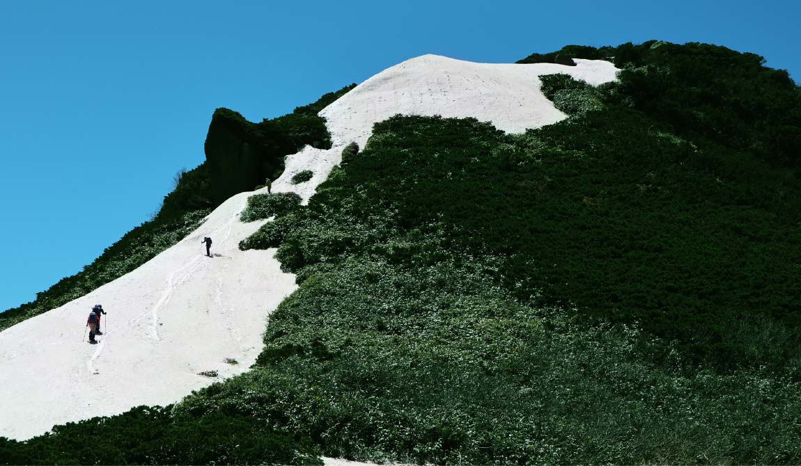 熊沢田代を越えるといよいよピークハントです。火山らしい山肌となり、沢筋の岩稜帯やザレ場を横切るトラバースがあります。晴れた日はなんのことはない登山道ですが、残雪や雨天は要注意。慎重に足を進めましょう。