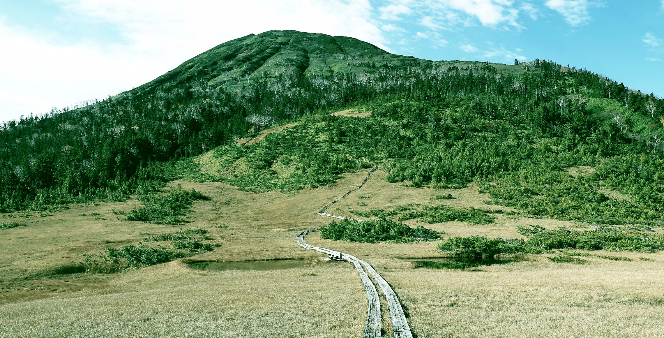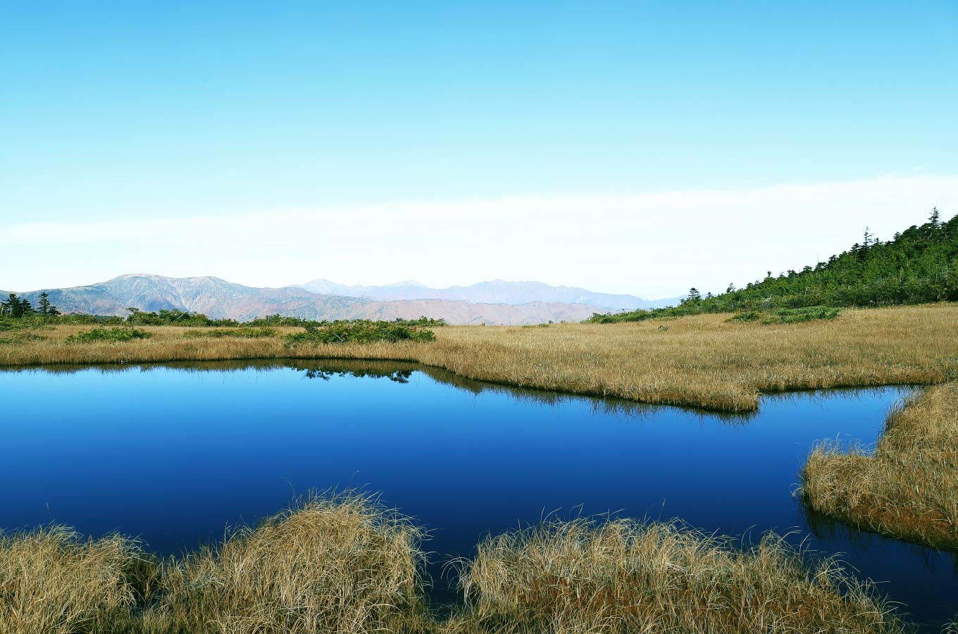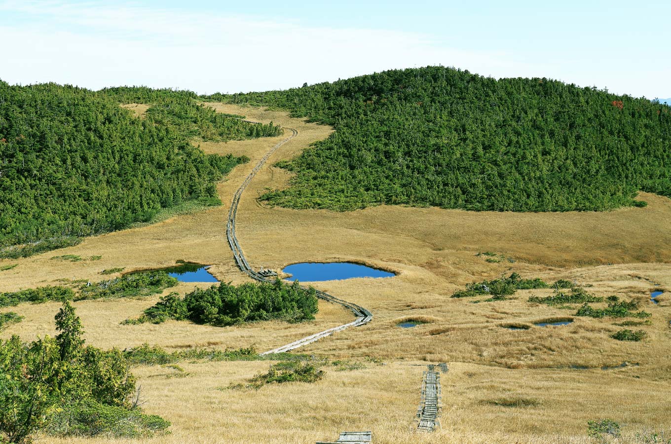 2つ目の急登を終えると縦に長い湿原が広がります。尾瀬有数の景観美を誇る熊沢田代です。田代の鞍部に2つの池があり、晴れた日は青空を映し、登山の疲れを癒やしてくれるでしょう。