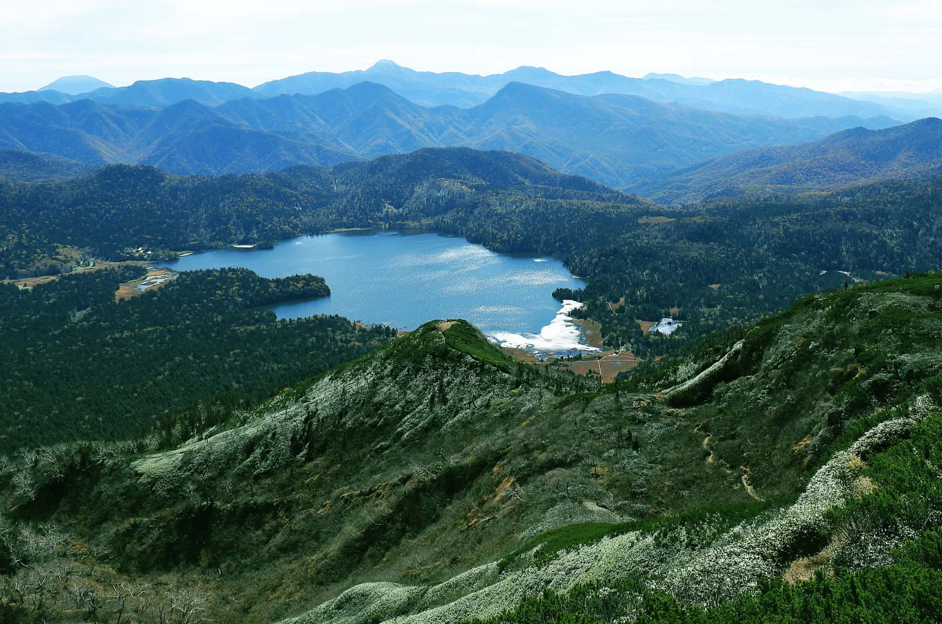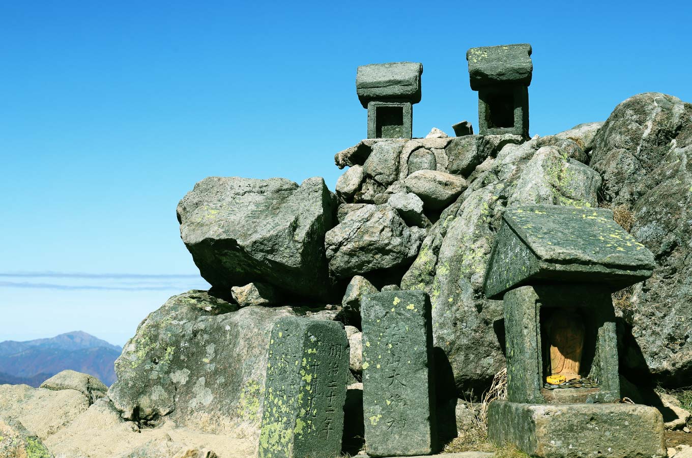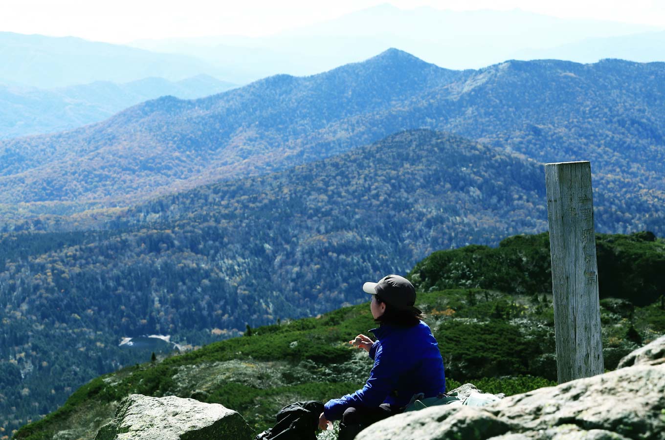 登山開始から標準タイムで4時間、燧ヶ岳登頂です。本コースで最初に登るのは俎嵓(まないたぐら)。標高2,346メートル。眼下の尾瀬沼から視界を上げていくと、那須岳、日光男体山、日光白根山と関東の山々が一望。北を向けば会津駒ヶ岳、その奥の東北の山嶺が地平線へ続きます。頂上には開山の祖である平野長蔵が担いで建立した石祠燧大権現が祀られています。