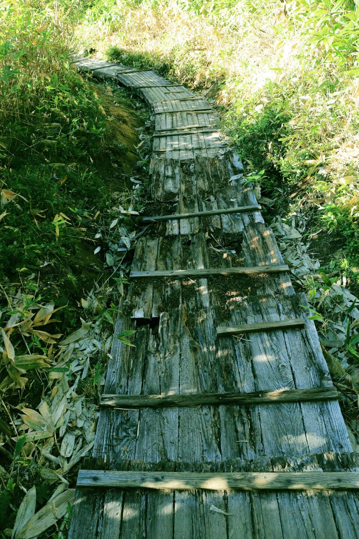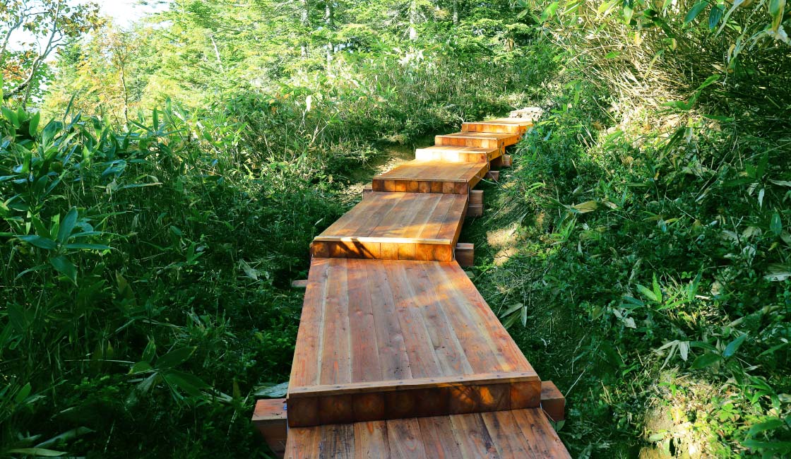 スタートすると幅広のゆるやかな木道の階段みちを登ります。